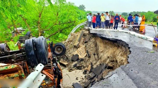 मिली जानकारी अनुसार, नेशनल हाइवे 27 का एक लेन देर रात धंस जाने से एक बड़ा हादसा होने से टल गया. क्योंकि वहीं से कुछ दूरी पर कई लोगों का कच्चा मकान है. भारी बारिश की वजह से सड़क का आधा हिस्सा गहरे गड्ढे में समा गया. लोडेड ट्रक फिसलकर नीचे गिर गया.