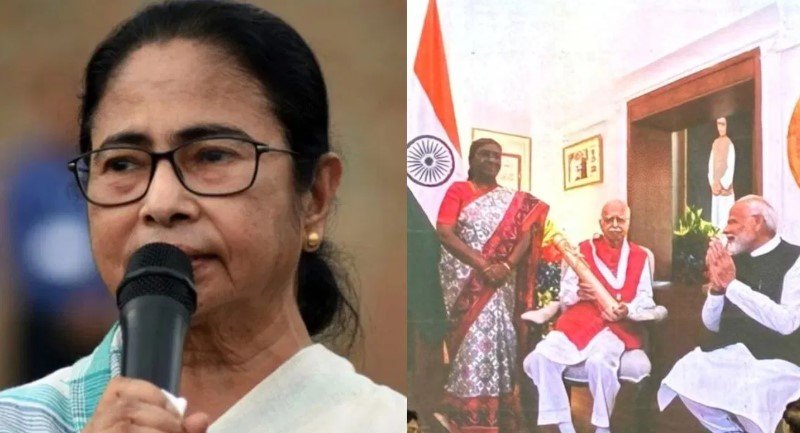 इस दौरान मुख्यमंत्री ममता बनर्जी ने एक तस्वीर दिखाते हुए सीधे तौर पर प्रधानमंत्री नरेंद्र मोदी पर निशाना साधा. तस्वीर में राष्ट्रपति द्रौपदी मुर्मू खड़ी होकर दिग्गज भाजपा नेता लालकृष्ण आडवाणी को भारत रत्न से सम्मानित कर रही हैं, जबकि प्रधानमंत्री मोदी बैठे हुए हैं.